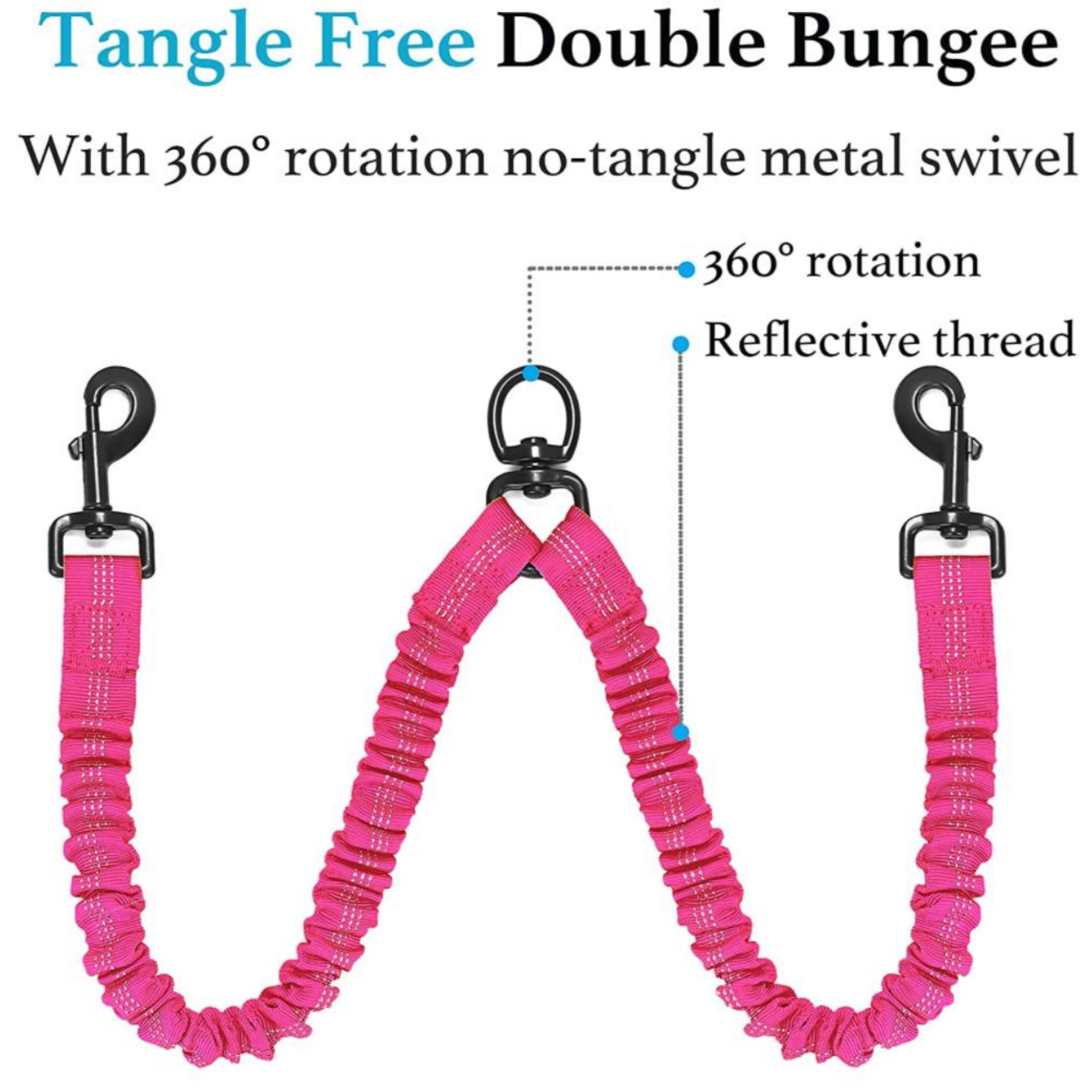 The bungee extension provides extra cushion while maintaining controlled movement and 360-degree rotation at all connection point eliminate leash tangling.